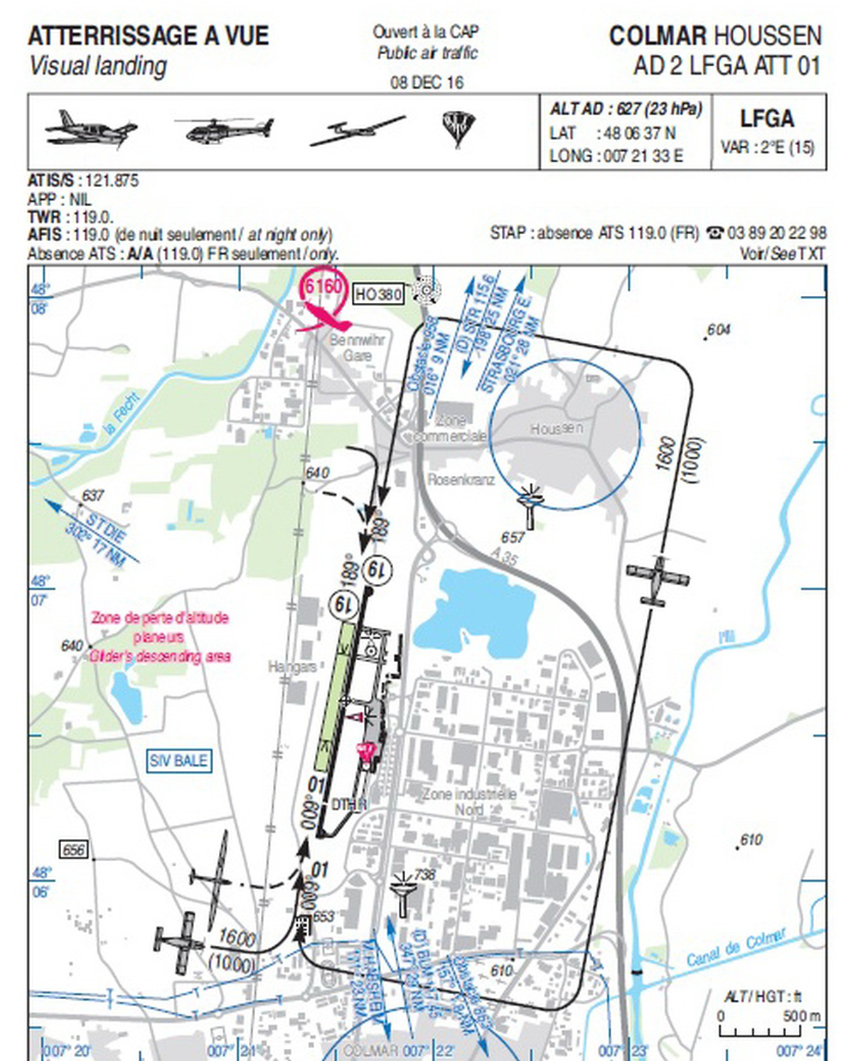 „D-BR, wind 100 degrees 6kts, cleared to land RWY 19!“ Obwohl Colmar Houssen (LFGA) ein unkontrollierter Flugplatz ohne CTR ist, funkt der Tower wie ein Großer.