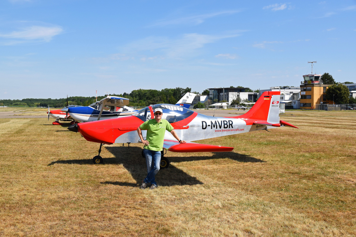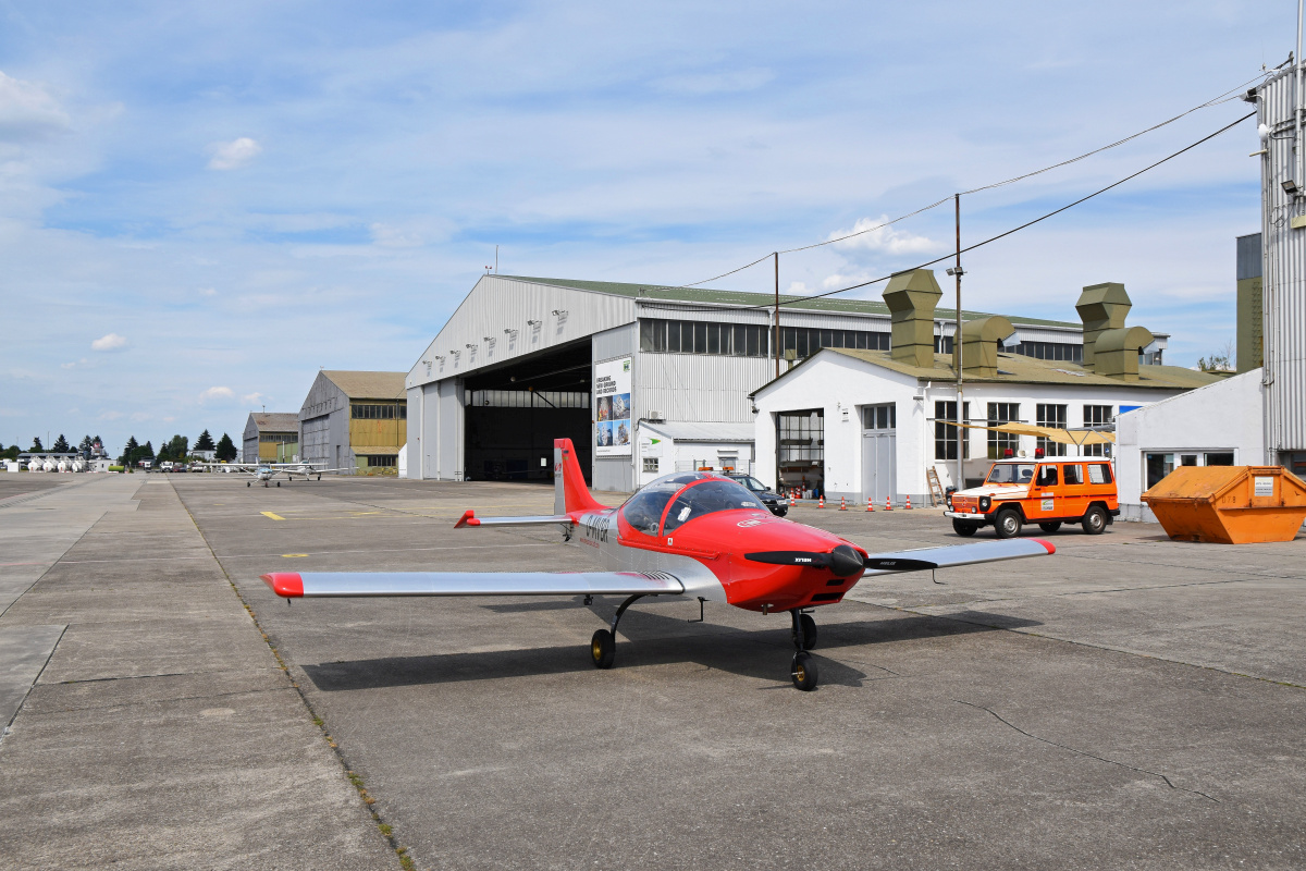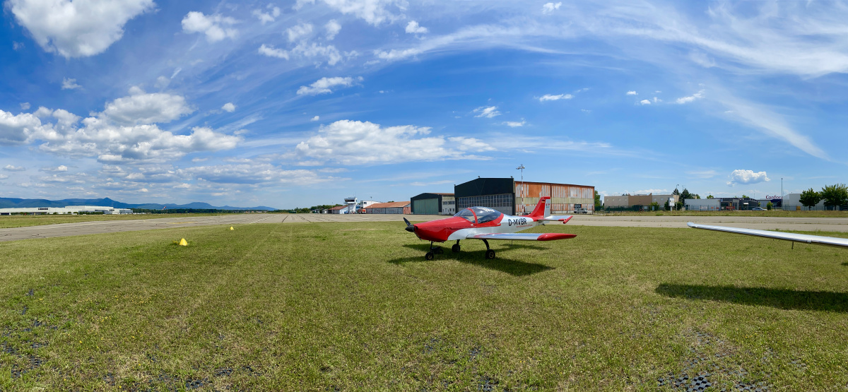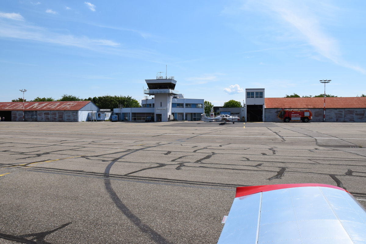 Auf dem riesigen Vorfeld, auf dem rein gar nichts los ist, dürfen wir parken. Nur gut 20 Flugminuten sind es von Colmar hierher.