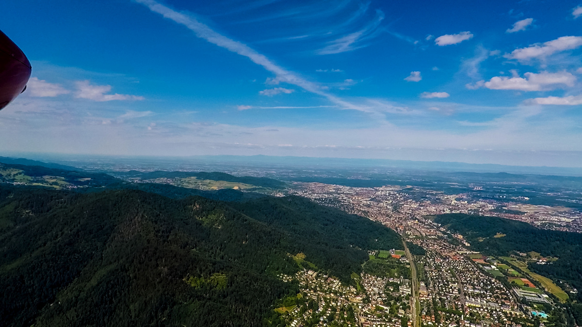 Wenige Minuten vor Erreichen von Freiburg melde ich mich bei der FIS ab. Es ist bereits das flache Elsass mit den dahinter liegenden Bergen der Vogesen zu sehen. Davor liegt die Stadt Freiburg mit dem Flugplatz (EDTF) am Stadtrand.