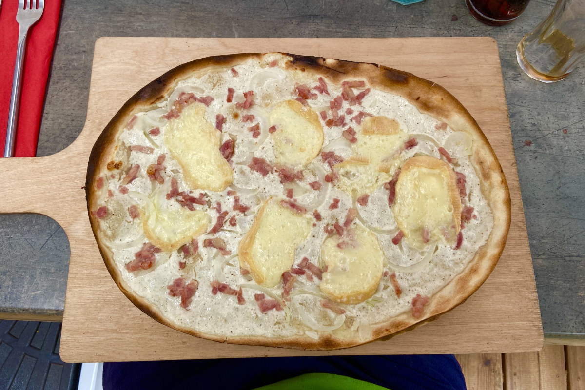 In einem Restaurant probieren wir eine der vielen Spezialitäten der Region: einen Flamkuchen mit Munster-Käse, der in den Vogesen unweit von Colmar hergestellt wird. Äußerst deliziös!