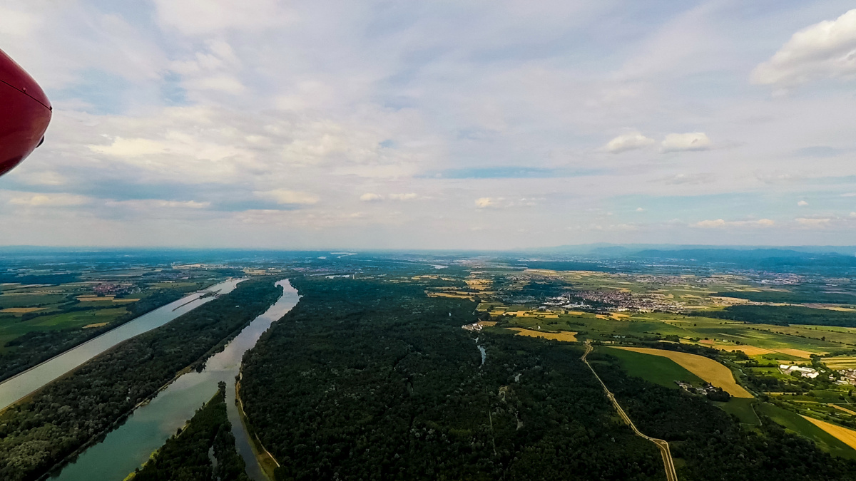 Kurz nach der angegebenen Zeit heben wir wieder ab. Unser Kurs ist eine gerade Linie hinüber nach Colmar. Langen Information ist nicht erreichbar. Daher melde ich mich gleich bei Bale Info an: „Bale Info, D-MVBR, bonjour!“ FIS: „D-MVBR, bonjour!“ Wir bekommen auf Englisch mit starkem französischem Akzent einen Squawk zugewiesen und können unsere Route wie geplant abfliegen. Nachdem wir den Rhein überquert haben, sind wir in Frankreich.