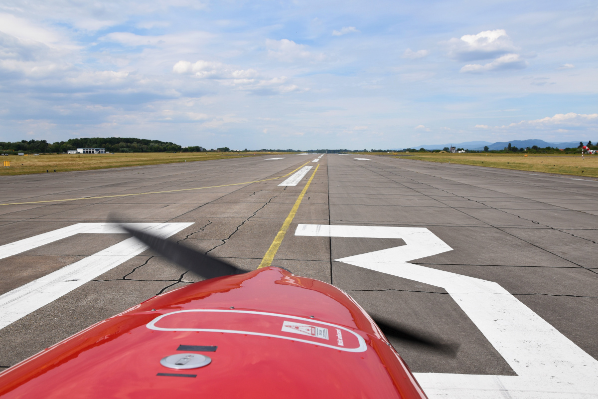 Unser Flugplan läuft für 15.15 Uhr. Um 15.12 Uhr startet Sven unseren Motor. Wenige Minuten später weist uns der TWR an: „D-BR, line up RWY 19 and wait!“ Vor uns geht noch ein Segelschlepp raus. Dann starten wir.