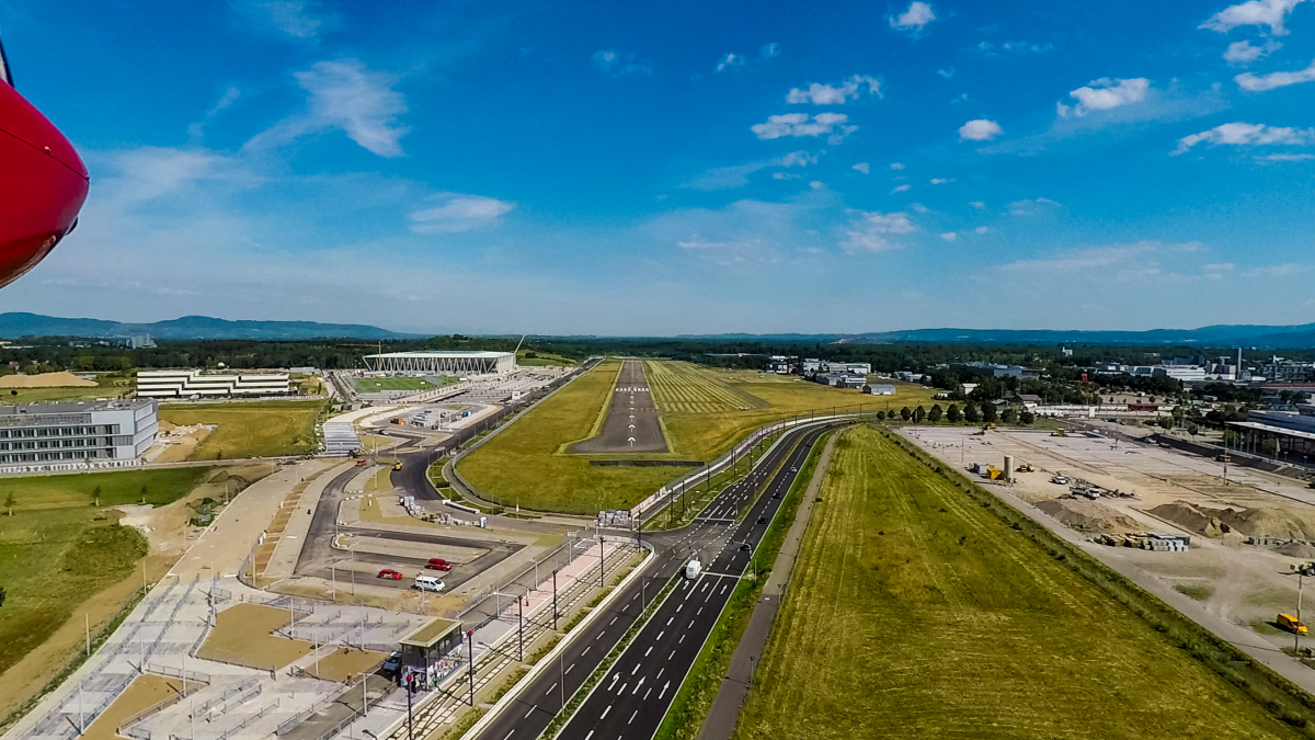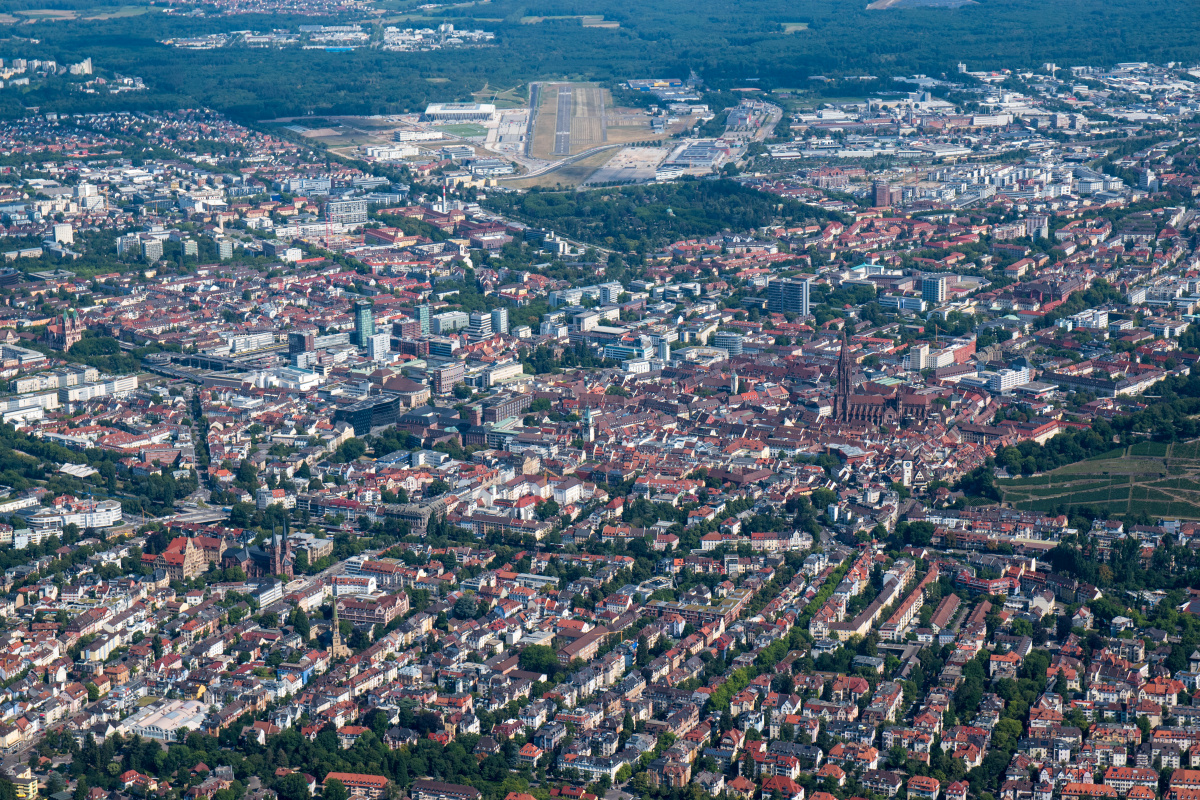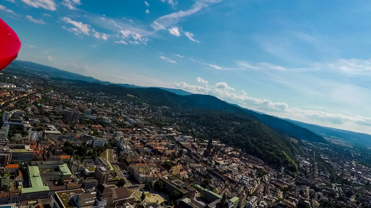 Obwohl leicht südlicher Wind, bekommen wir die 34 für die Landung zugewiesen. Das freut uns, denn dieser Anflug verläuft spektakulär über die Innenstadt von Freiburg.
