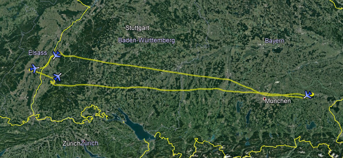 Unsere Route führt uns zunächst über die Stadt München. Dann an Memmingen vorbei. Kurz vor der Schwäbischen Alb melde ich mich von Langen Information ab und bei Zürich Information an: „Zürich Information, D-MVBR, grüezi!“ FIS: „D-MVBR, Zürich Information, grüezi, pass your message!“ „D-MVBR, microlight Breezer, VFR from Ampfing to Freiburg, present position abeam Mengen, 4700ft, squawk 7000, request traffic information!“ FIS: „D-BR, squawk 4250, next report Schwenningen!“