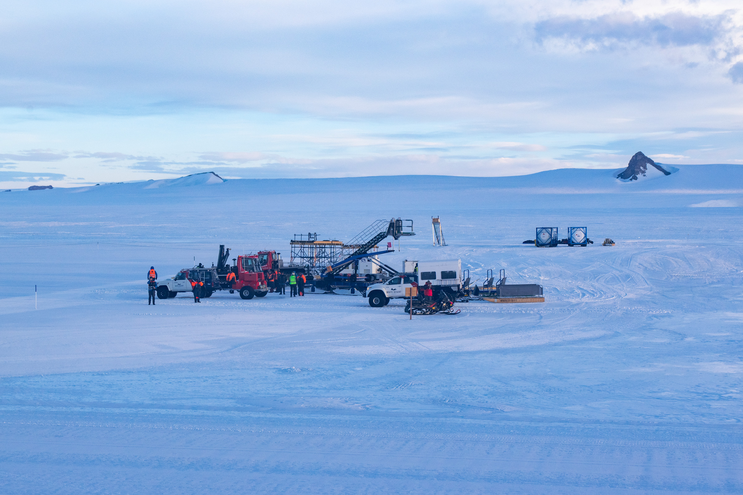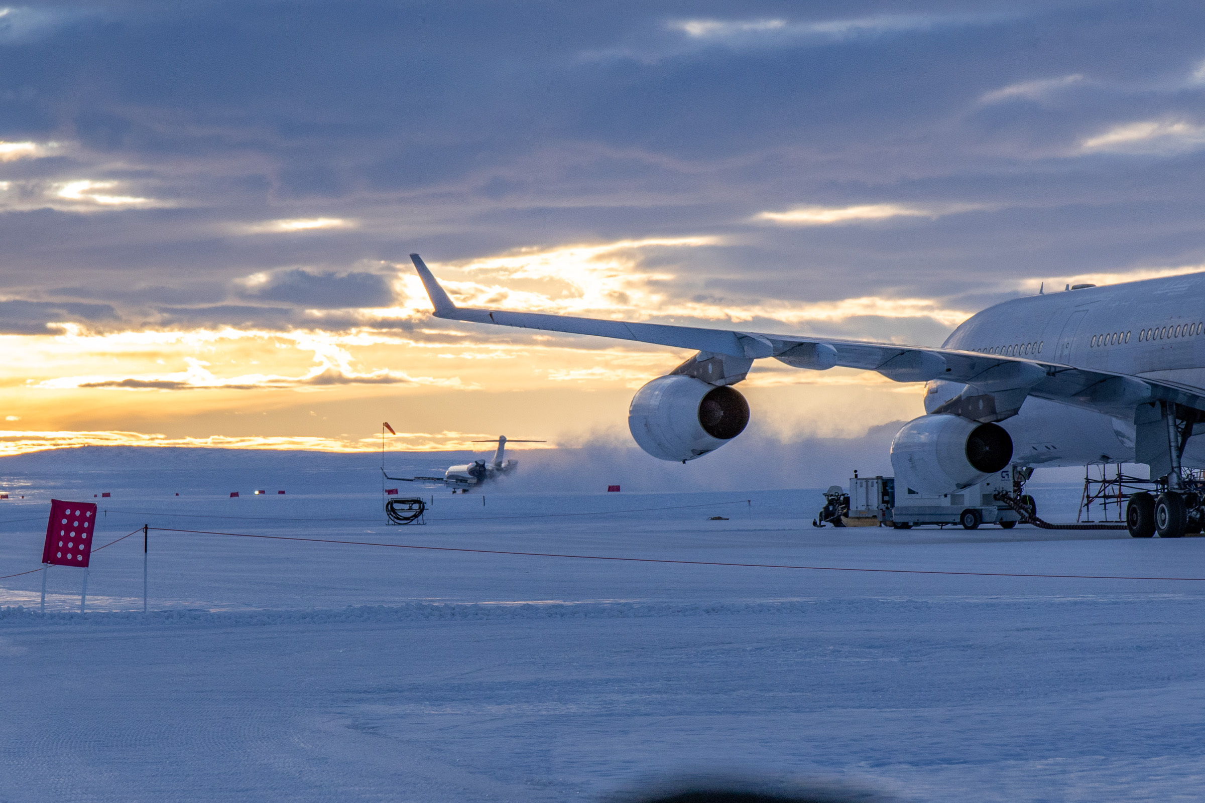 Nach 2000m gibt es eine Wendebucht. Im Schritttempo rollte der A340 zurück zum Anfang der Bahn, wo sich das 200x150m große Vorfeld befindet. Begleitet wird er von einem der beiden Feuerwehrfahrzeuge, die Notfallausrüstung und Schaum als Löschmittel dabei haben. Auf dem Vorfeld werden Triebwerk zwei, drei und vier abgeschaltet. Das linke äußere Nr. 1 läuft zusammen mit der APU die komplette Bodenzeit über weiter. Denn würde die APU ausfallen, stünde kein Strom mehr zum Starten der Triebwerke zur Verfügung und der A340 würde in der Antarktis festsitzen. Eine Pistenraupe bringt die Passagiertreppe – natürlich auf Schneekufen, wie auch alles andere. Dann beginnt für die Gäste der einwöchige Aufenthalt in der Antarktis. Oder aber auch nur ein Tagesausflug mit drei bis vier Stunden auf dem Eis. Je nach Budget. Für die längeren Aufenthalte stehen das Whichaway Camp, 130km / 30 Flugminuten mit der Basler BT-67 oder Twin Otter entfernt an der Küste gelegen, zur Verfügung, oder die beiden Camps Echo und Wolf’s Fang unweit der Landebahn.