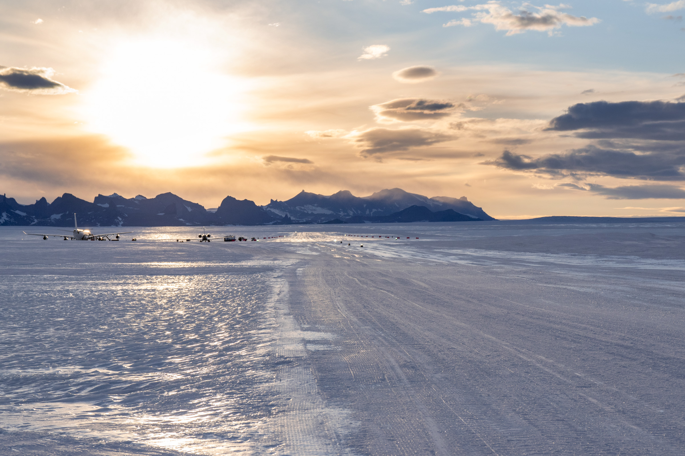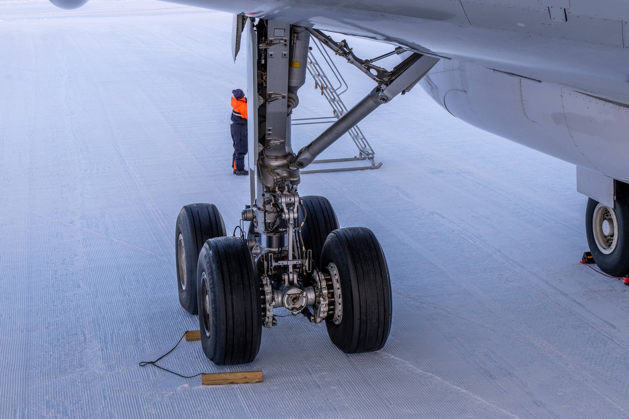 Fünfeinhalb Stunden nach dem Start in Kapstadt ist der A340 gelandet. Die Wolf’s Fang Runway hat internationale Maße. Sie ist 3000m lang und 60m breit. Notfalls stünden den Piloten sogar 150m Breite zur Verfügung. Markierungen gibt es nicht, lediglich Fahnenstangen mit roten Planen an deren Begrenzungen sowie aufgestellte Scheinwerfer. Das ganze befindet sich auf 1400m dickem Gletschereis. Genau gesagt ist es Blaueis. Das ist ein Gletschereis, welches sich durch umgebende Berge nicht schnell bewegen kann und dadurch keine Gletscherspalten und Lufteinschlüsse aufweist. Ideal für den Ort einer Landebahn für schwere Jets. Allerdings ist es nicht einfach, so eine Piste zu pflegen. Vor jeder einzelnen Landung fahren Pistenraupen 22 Stunden lang auf und ab und präparieren diese. Mit den Schaufeln werden Rillen ins Eis geschabt. Diese geben den Flugzeugrädern die nötige Griffigkeit. Ist die Außentemperatur wärmer als -6°C, kann nicht mehr gelandet werden. Denn dann ist das Eis zu matschig und die Bremswirkung lässt rapide nach. Jedes Jahr bewegt sich das Eis mit der Landebahn um 24m nach Norden in Richtung Küste. Daher muss sie jedes Jahr zu Saisonbeginn wieder an den Ursprungsort zurückverlegt werden.