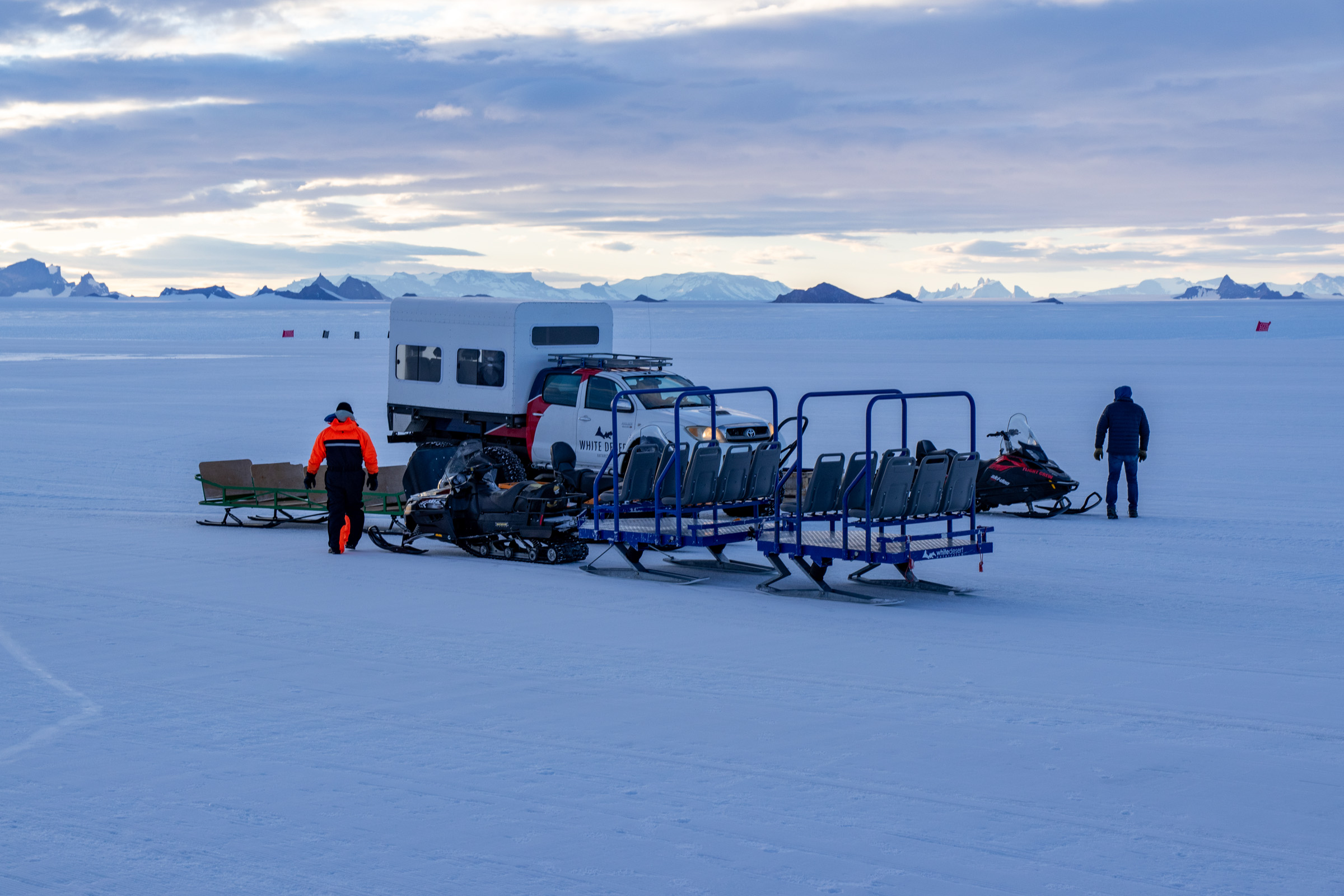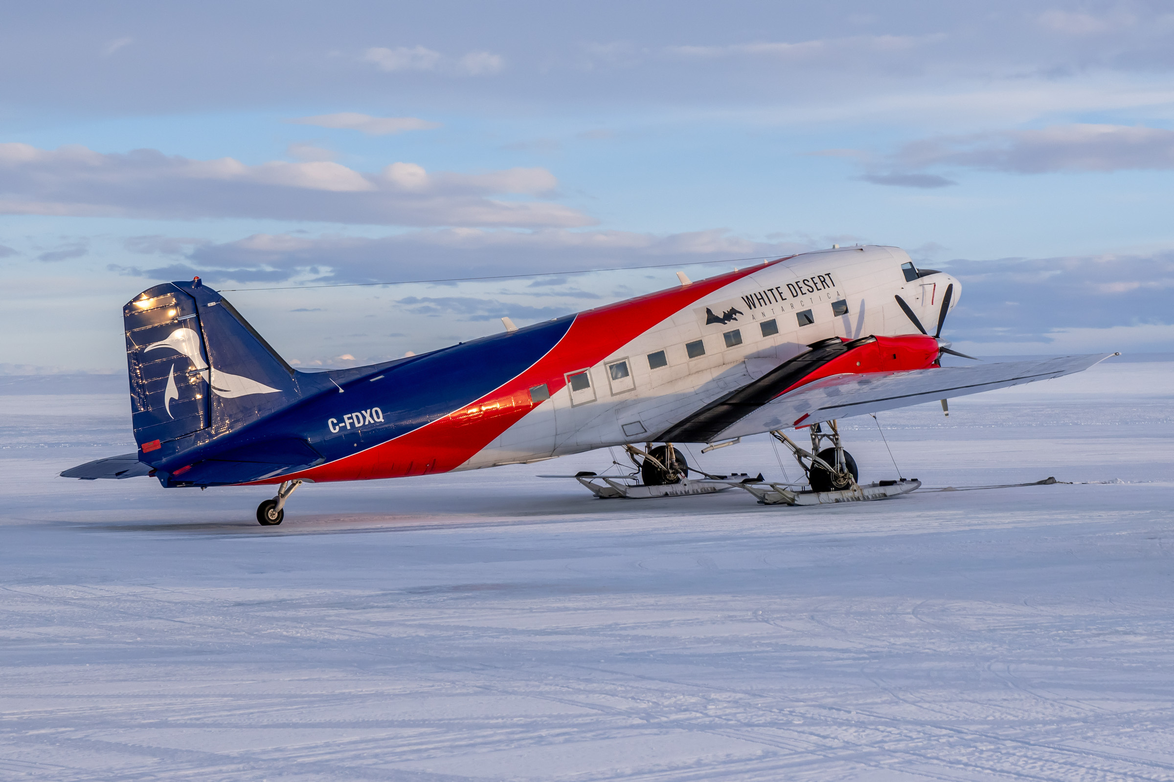 Das Whichaway Camp besteht aus sechs beheizten Polarkapseln und bietet sogar eine Sauna. Das Echo Camp kann bis zu 12 Personen beherbergen. Dessen „Sky Pods“ wurden nach Inspirationen von Astronauten und Star Wars designt. Wahrlich fühlt man sich hier wie auf einem anderen Planeten. Das Wolf’s Fang Camp ist etwas schlichter, aber dennoch Luxus. Es bietet sechs beheizte Schlafzelte mit eigenen Waschräumen. Alternativ werden noch Flüge zur Pinguinkolonie in der Akta Bay an der Küste mit einer Flugzeit von zweieinhalb Stunden und Flüge zum geografischen Südpol angeboten. Letzterer ist 2040km oder satte sieben Flugstunden entfernt. Für die innerantarktischen Flüge kommen zwei Basler BT-67 und eine DHC-6 Twin Otter zum Einsatz. Diese gehören ALCI Aviation, werden aber hauptsächlich von White Desert genutzt. Daher tragen sie auch die Lackierung des Reiseveranstalters. Die Turboprops starten vom Skiway, einer Schneepiste für Schneekufen, direkt neben der Wolf’s Fang Runway.