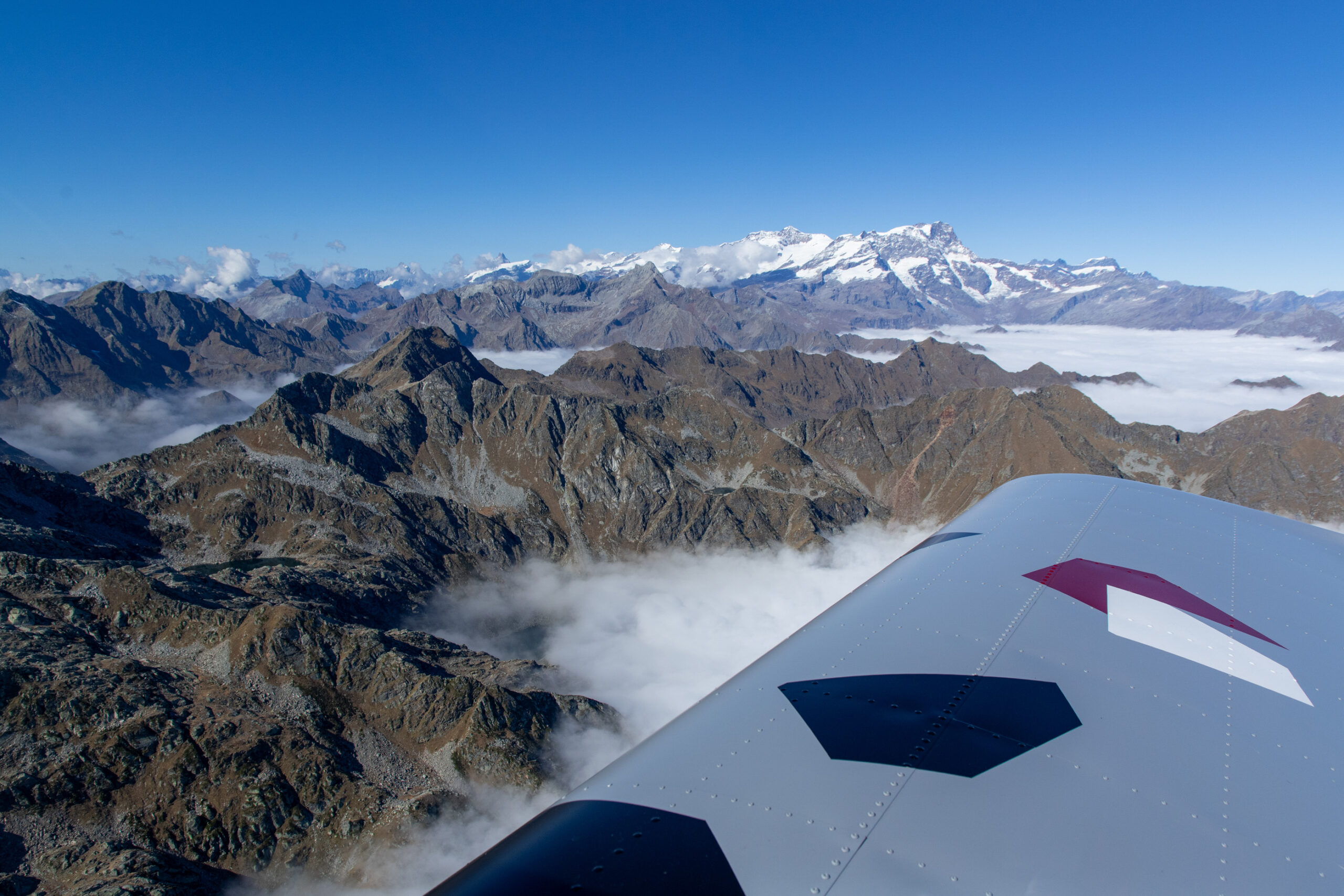 Um 11.30 Uhr verlassen wir Kufstein und steigen auf 4600ft. Mehr geht nicht, denn über uns auf 5500ft hängt die Hochnebeldecke, die auch ganz Süddeutschland heute bedeckt. Immerhin haben wir unter uns keinen Nebel mehr. Die Sicht ist gut. Auf Höhe Innsbruck biegen wir ins Brennertal ein. Das engste Tal auf unserer Flugstrecke heute. Zumindest auf dieser Flughöhe. Kaum passieren wir die Grenze nach Italien, reißt die Hochnebeldecke auf und wir fliegen in einen strahlend blauen Himmel ein! Bella Italia – was für eine Begrüßung! Nun können wir ungehindert auf 10.000ft steigen. Über Meran geht es zur beeindruckenden Adamello-Kette. Mit deren Gletschern sind wir direkt auf Augenhöhe. Dann folgen wir dem Tal nach Sondrio. Hier wäre unser Tankstopp falls nötig. Doch eine aktuelle Spritberechnung zeigt, dass wir bis zu unserem ersten Etappenziel Aosta ohne Zwischentanken kommen. Also bleiben wir auf 10.000ft und steuern nun den Zipfel der Schweiz bei Lugano an.