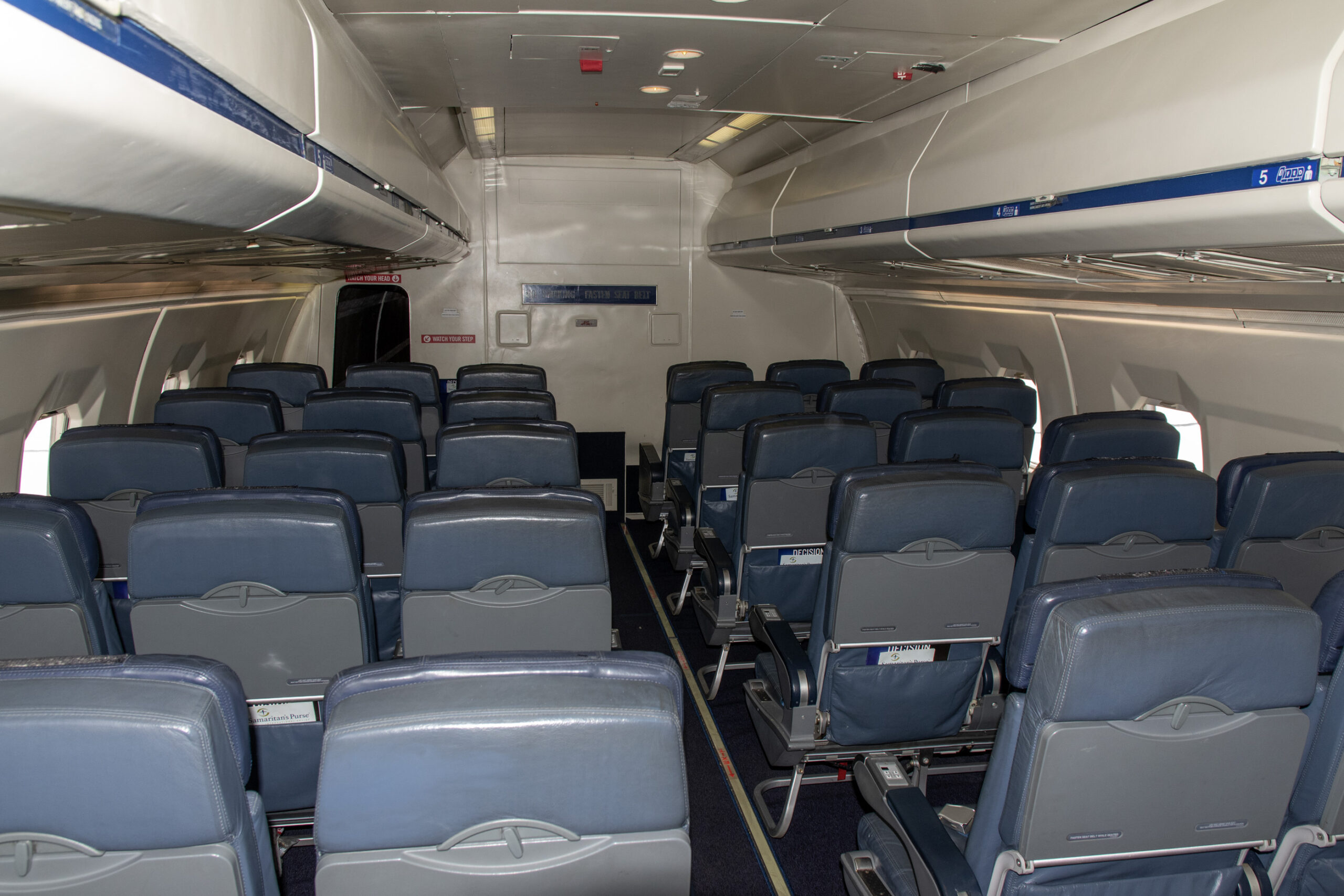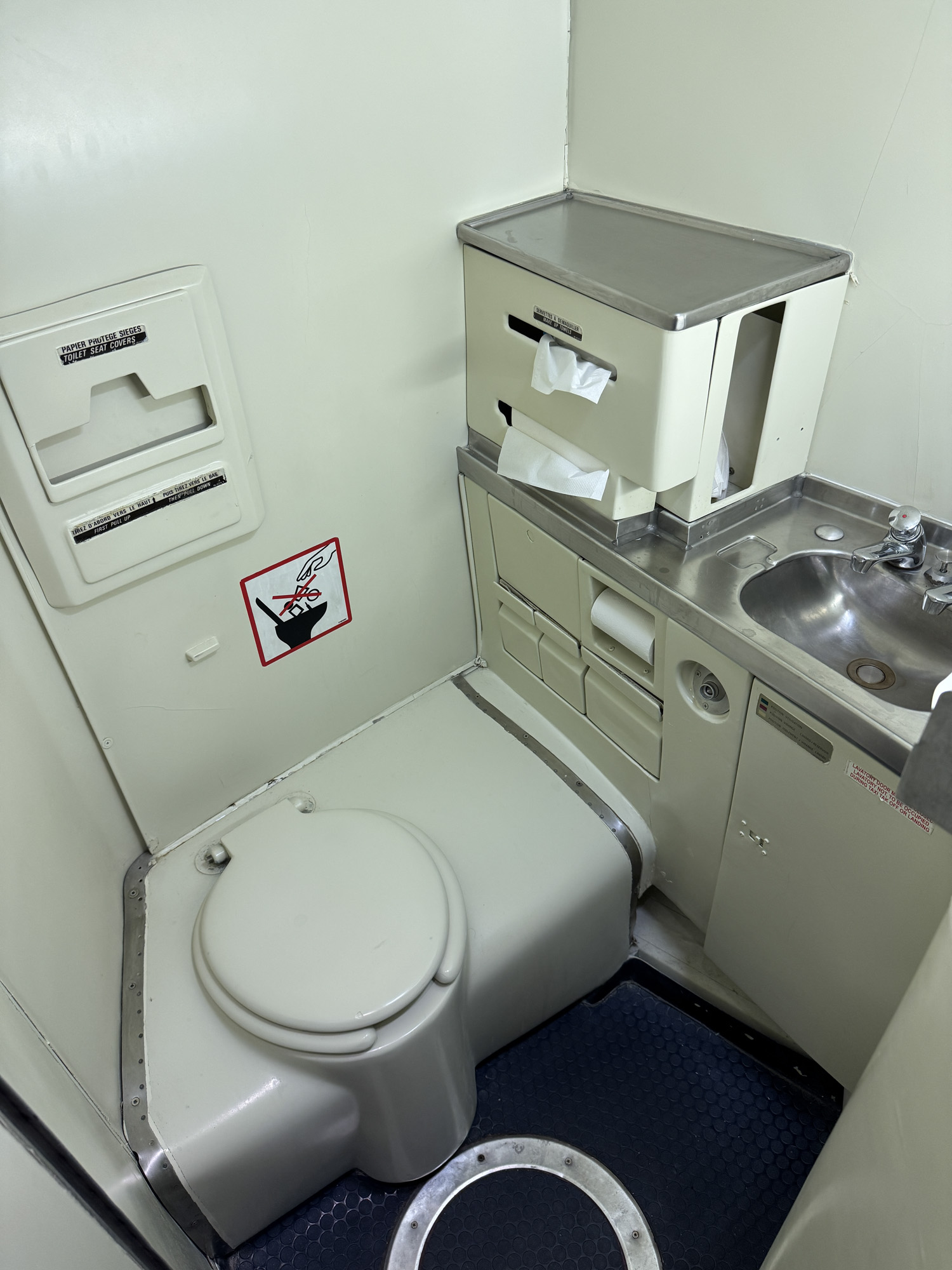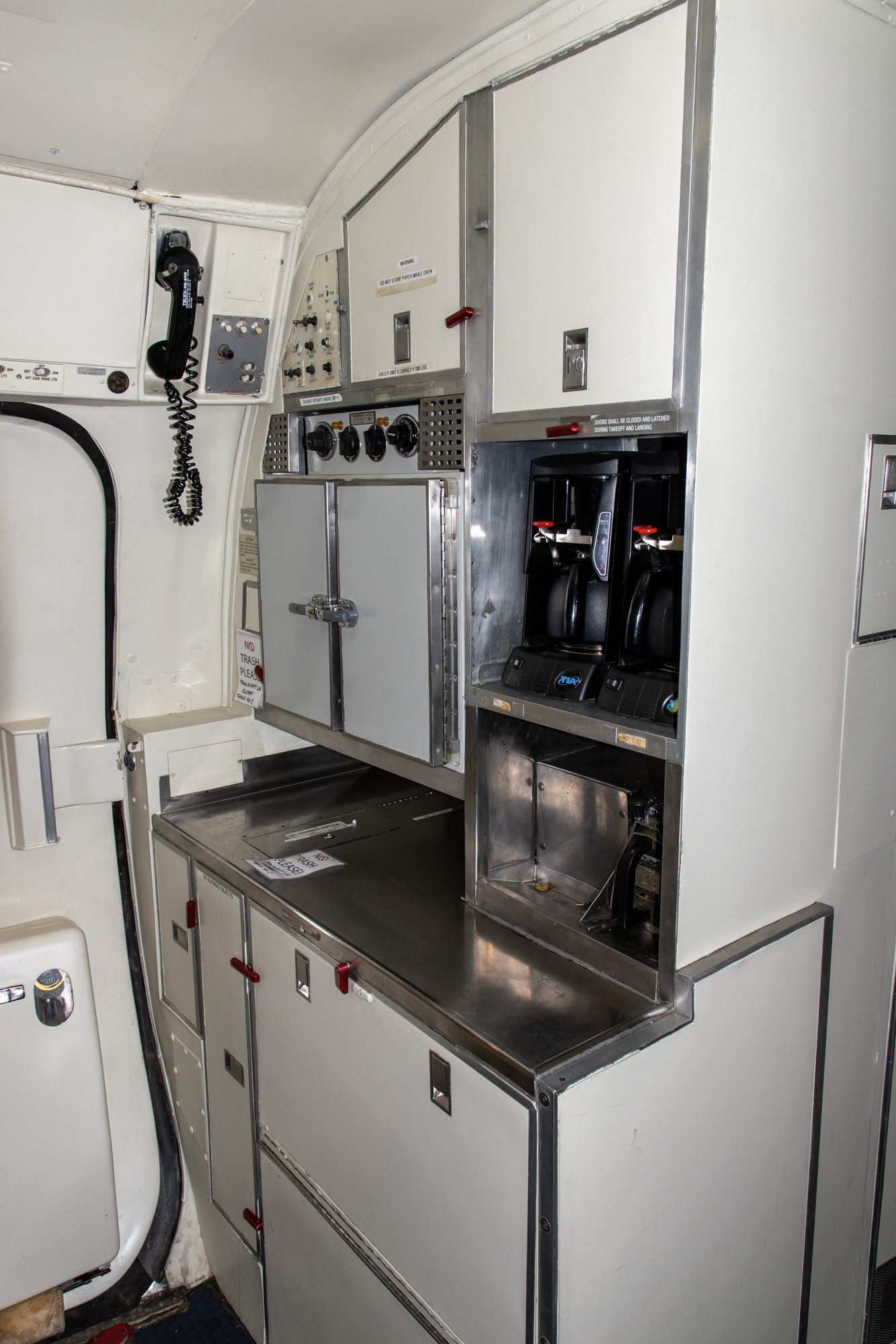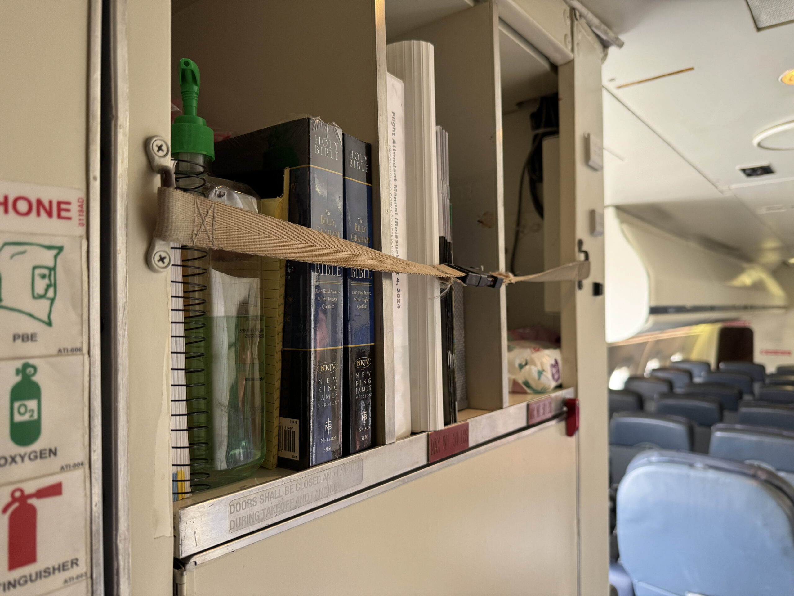 Mittlerweile hat die DC-8 die Reiseflughöhe erreicht. Die beiden Flugbegleiterinnen, die nach FAA-Standard zertifiziert sind, beginnen mit ihrem Service. Dieser besteht aus einem charmanten Lächeln, viel Freude bei der Arbeit und Getränken. Donuts und Süßkram hat es bereits vor dem Flug im Empfangsbereich von Samaritan’s Purse gegeben. Die heutigen Passagiere sind Mitarbeiter der Hilfsorganisation und sieben Journalisten. Die 32 Sitzplätze hinter der Abtrennung zum Frachtbereich sind alte Economy-Sitze von American Airlines. Auffällig im Vergleich zu den heutigen sind die Fenster: quadratisch und relativ groß. Drückt oder besser gesagt zieht man den Stewardess-Rufknopf, klingelt zur Belustigung der heutigen Gäste eine richtige Glocke im hinteren Bereich der Kabine. Nachgerüstet wurden Steckdosen und sogar USB-Buchsen in jeder Sitzreihe an der Außenwand. Die Toilette ist noch auf dem Stand der 60/70er Jahre geblieben. Nicht fehlen dürfen bei Samaritan’s Purse mehrere Bibeln im Regal neben der Küchenzeile.