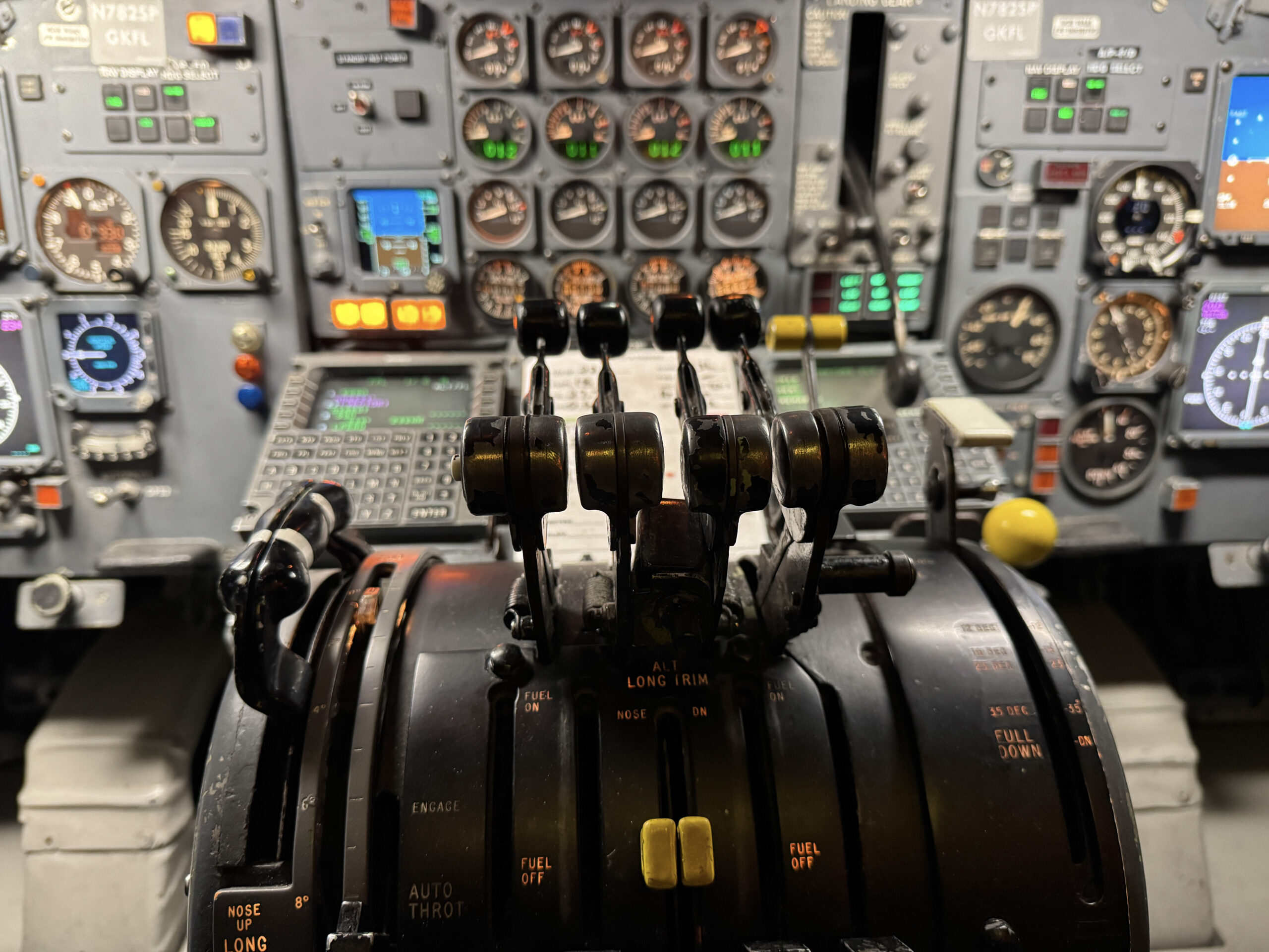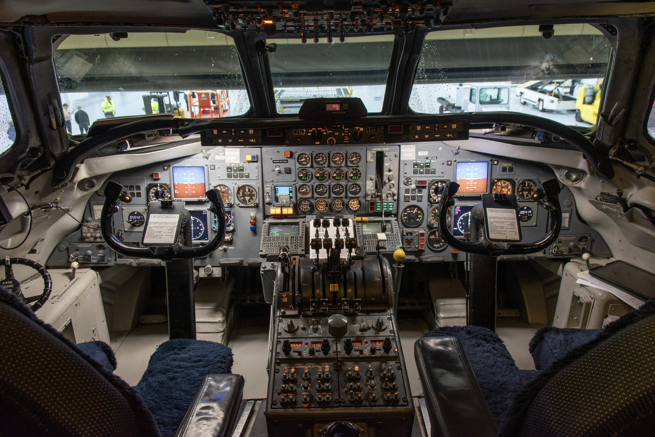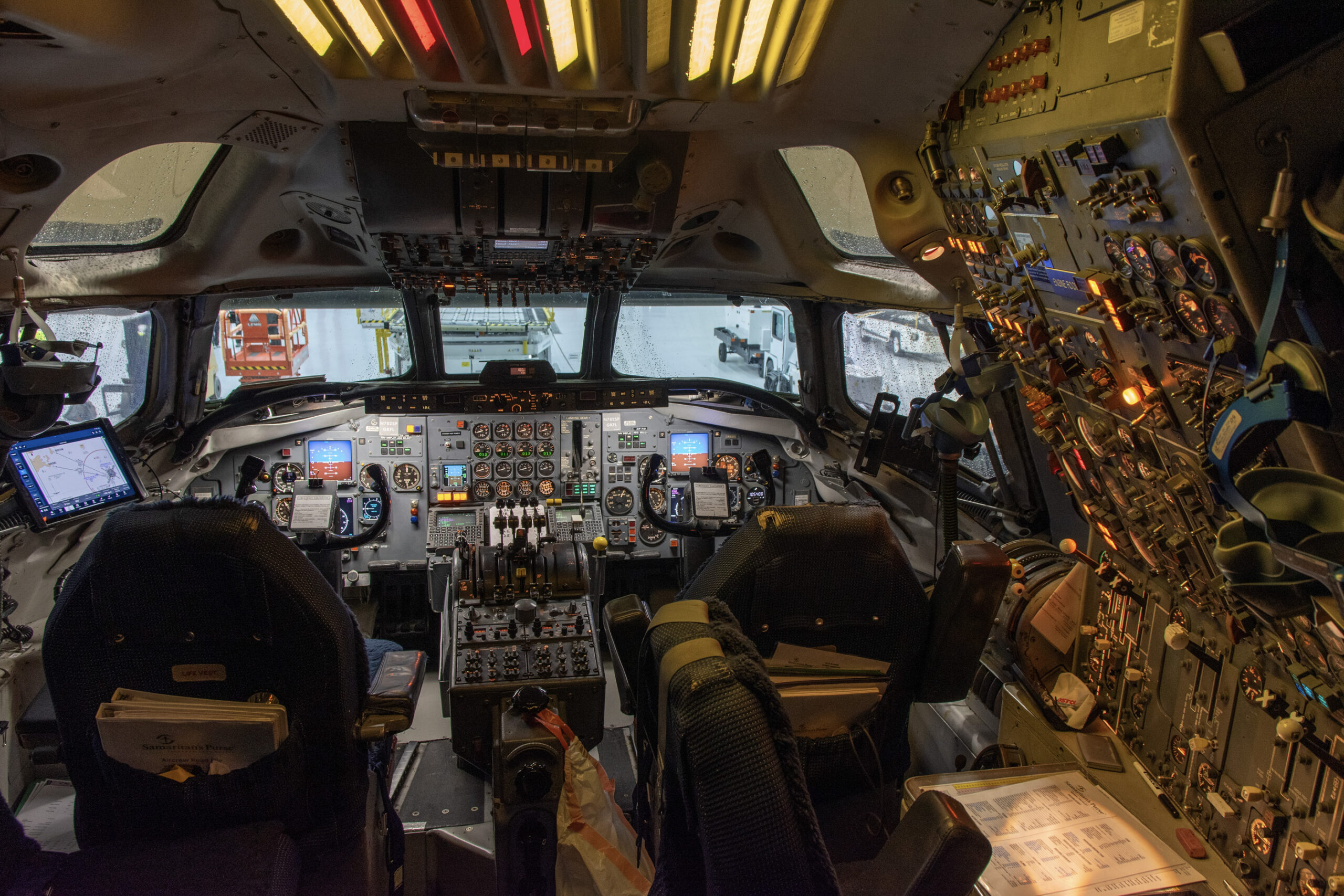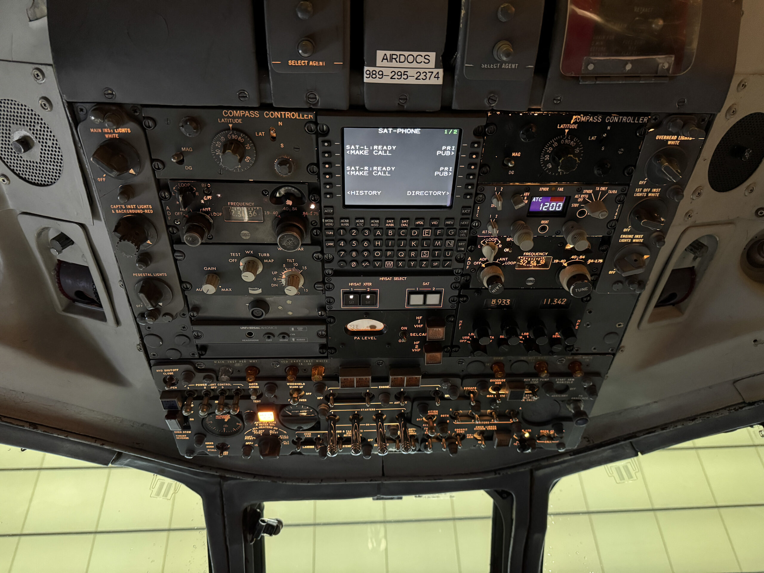 In der Samaritan’s Purse ist noch fast alles analog. Nur der künstliche Horizont und sein Backup sowie die Navigationsanzeige, das Variometer samt integriertem TCAS und die beiden FMC (Flight Management Computer) sind nachgerüstete Bildschirme. Zusätzlich wurde im Bedienfeld über den Piloten eine Anlage für ein Satellitentelefon eingebaut. Besonders herausstechend sind vier lange silberne Hebel in der Mitte des Overhead Panels. „Das sind die Hebel zum Starten der Triebwerke. Da dieser Vorgang bei der DC-8 sehr lang dauert und der Hebel die ganze Zeit gehalten werden muss, hat man diese im Gegensatz zum Original verlängert und vergrößert, um das ganze angenehmer für die Piloten zu machen“, erklärt Klischer. Was die DC-8 sonst noch besonders macht für Klischer: „Das Dreimann-Cockpit“, sagt er. „Durch den Bordingenieur hat man immer ein drittes Gehirn und somit eine Meinung mehr im Cockpit und kann ein mögliches Problem besser abarbeiten oder einen Sachverhalt besprechen.“