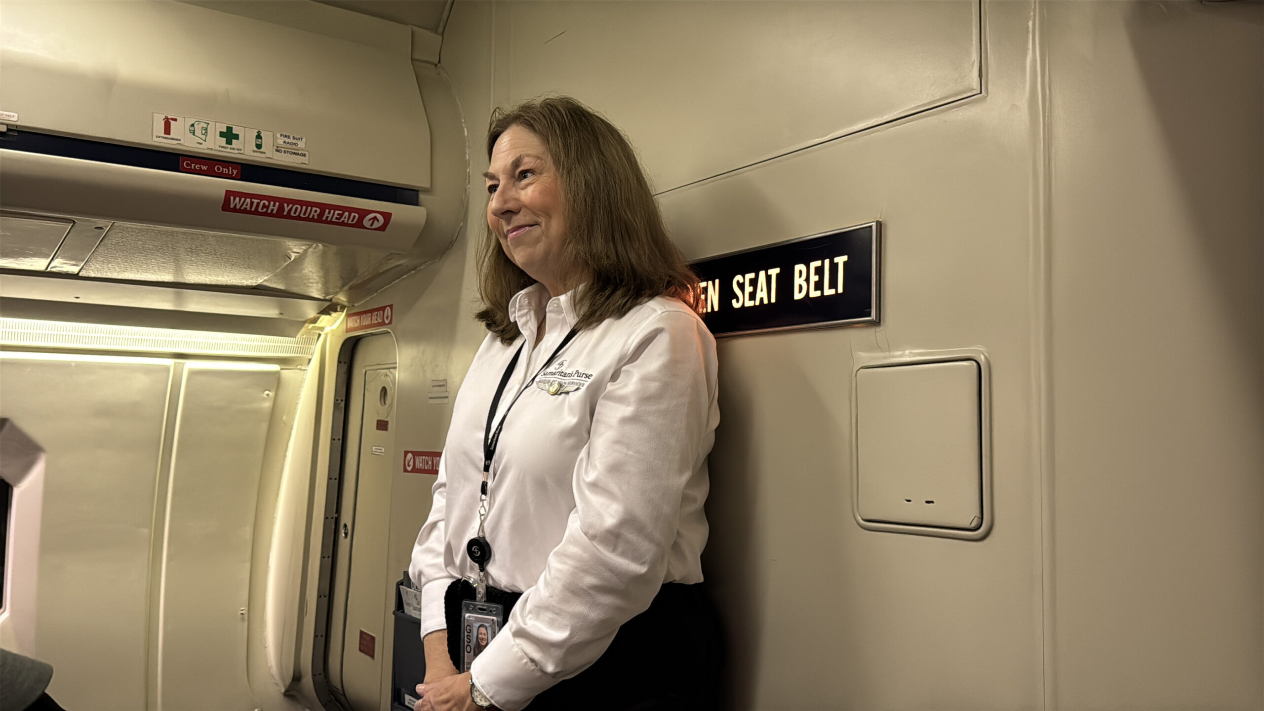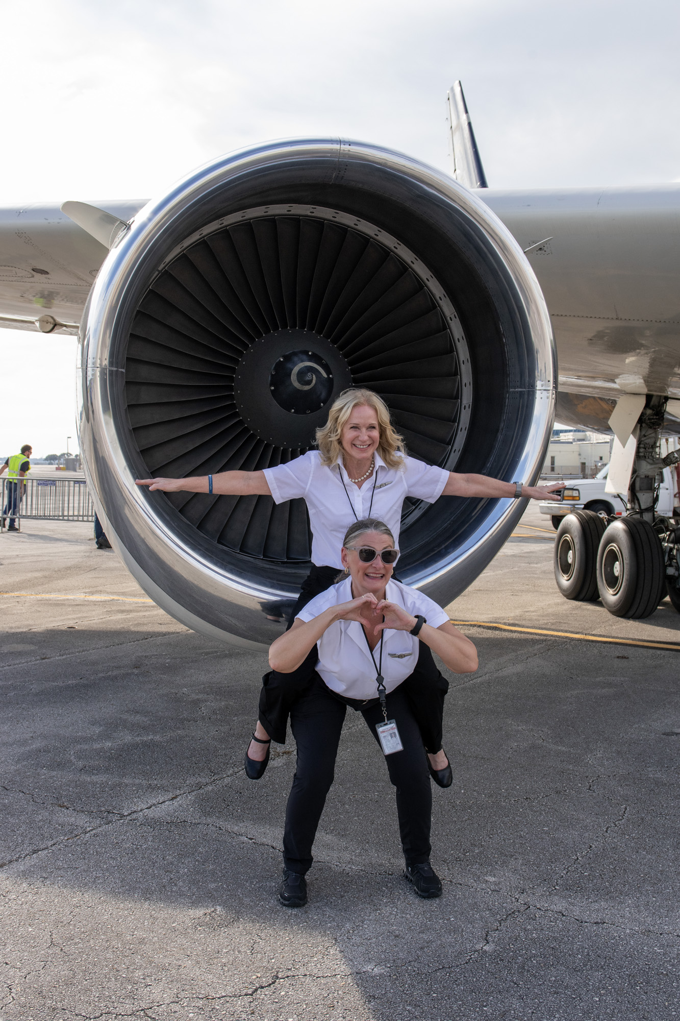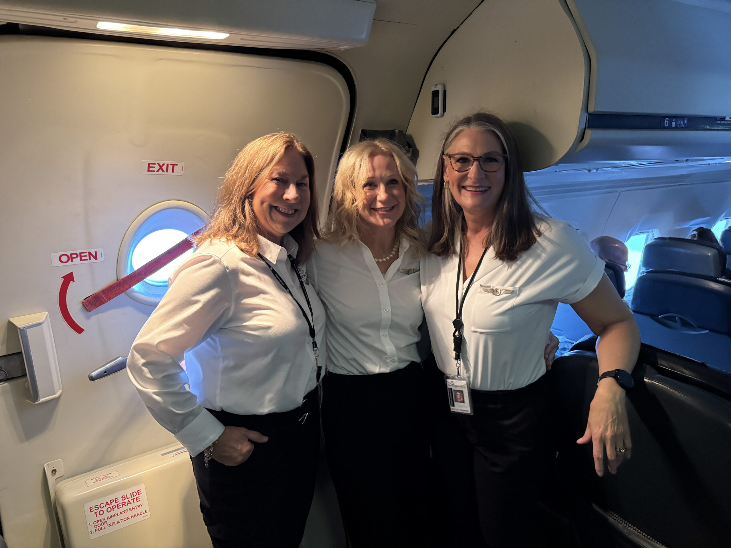 • ausgelassene Stimmung an Bord bei den drei Flugbegleiterinnen