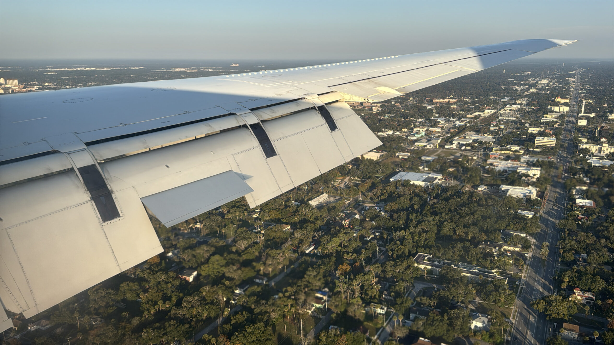 Etwa eine Stunde nach dem Start in Greensboro setzt die N782SP auf der RWY 25R von Daytona Beach in Florida auf. Etwas härter als man es von heutigen Flugzeugen gewohnt ist. In der Kabine fällt der Kommentar: „That was a DC-8 landing!“ In der Tat ist die DC-8 für etwas härter empfundene Landungen bekannt. Das liegt einerseits am kurzen Federweg des Fahrwerks. Dadurch wird die Energie beim Aufsetzen weniger weich absorbiert. Andererseits an der im Vergleich zu modernen Verkehrsflugzeugen ähnlicher Größe etwas höheren Landegeschwindigkeit sowie der relativ geringen Flügelwölbung (kein modernes Hochauftriebssystem). Dadurch bleibt weniger Zeit, die Sinkrate im letzten Moment auszuflairen.