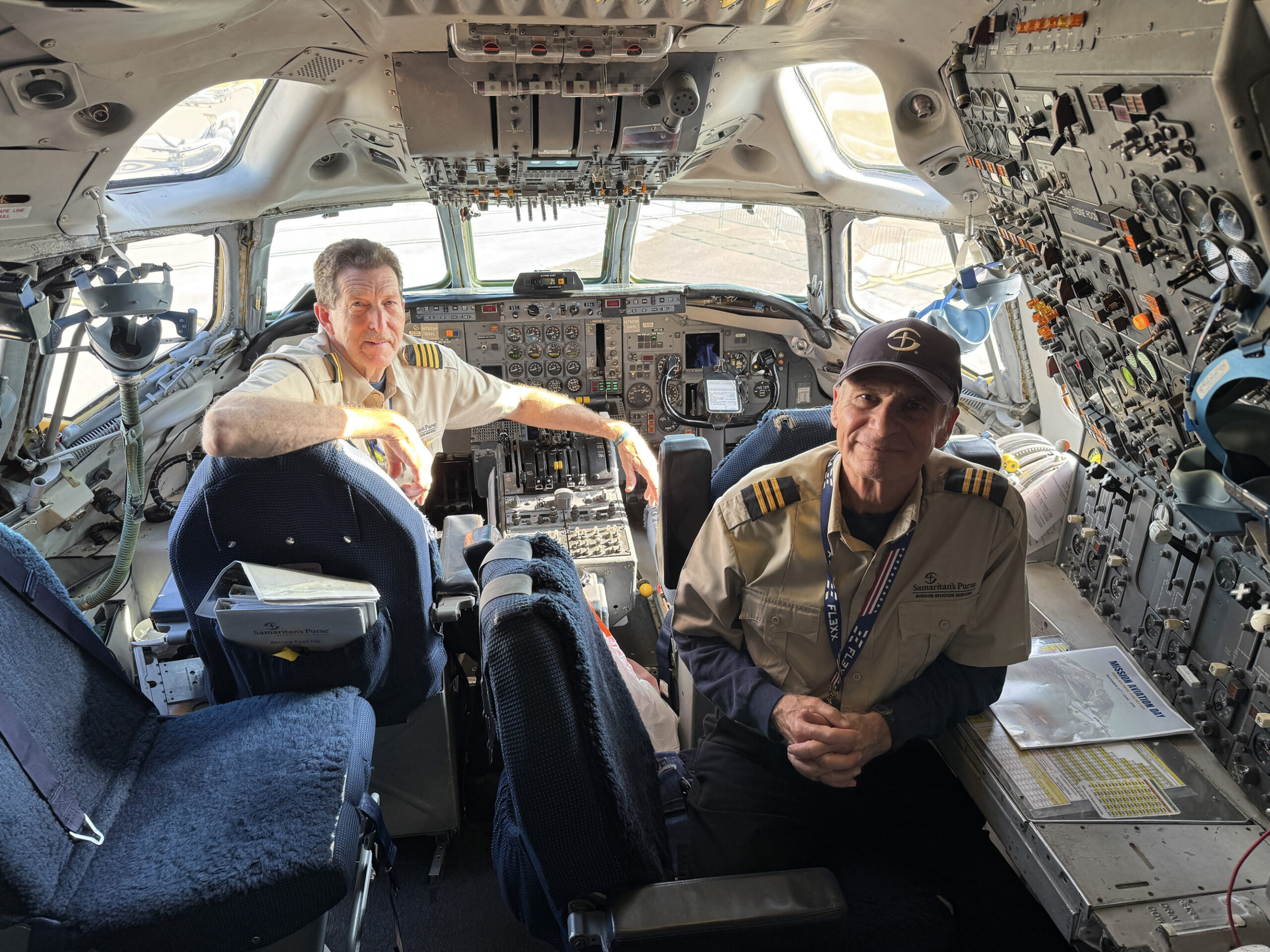 • Captain Andy Klischer und Bordingenieur Joe Proffitt im Cockpit der DC-8